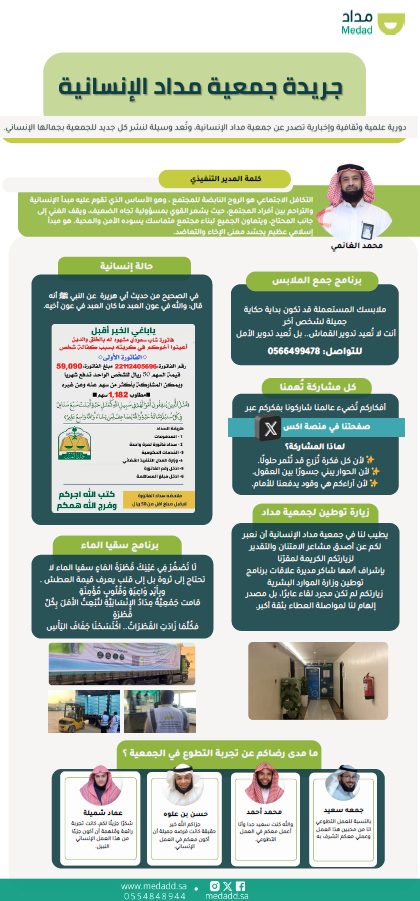 جمعية مداد للخدمات الإنسانية بجدة، تحت إشراف المركز الوطني لتنمية القطاع غير الربحي، ترخيص رقم (5267) بتاريخ 1444/11/11هـ وهي جمعية أهلية تقدم خدماتها لكافة منطقة مكة المكرمة، ومتخصصة في تقديم المساعدات للأسر المتعففة ونقلهم من دائرة الاحتياج إلى دائرة الإنتاج.